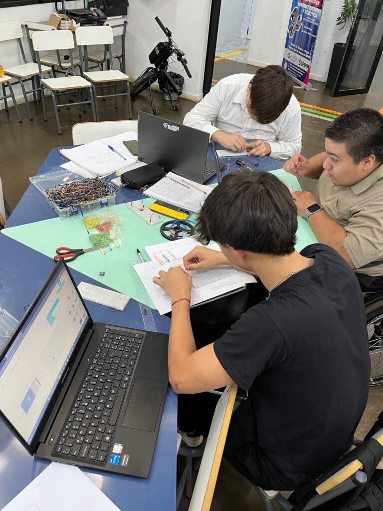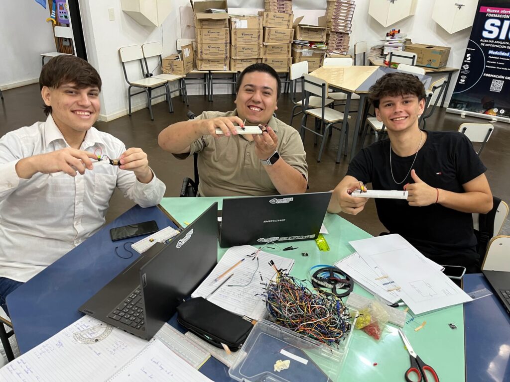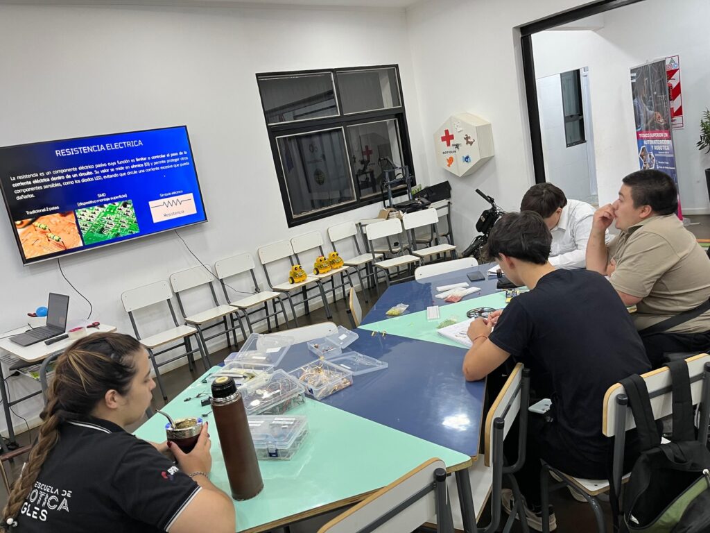 Área desarrollada: Componentes eléctronicos conceptos y su funcionamiento( resistencia, led, pulsadores, placas de pruebas, batería). Esquema eléctrico y su importancia en la electrónica, armado en protoboar usando los componentes explicados en la clase (encender un led usando bateria 9 voltios, pulsador, resistencia y led). Dibujo de esquema en hoja técnica. Conclusión, observación, hipótesis.