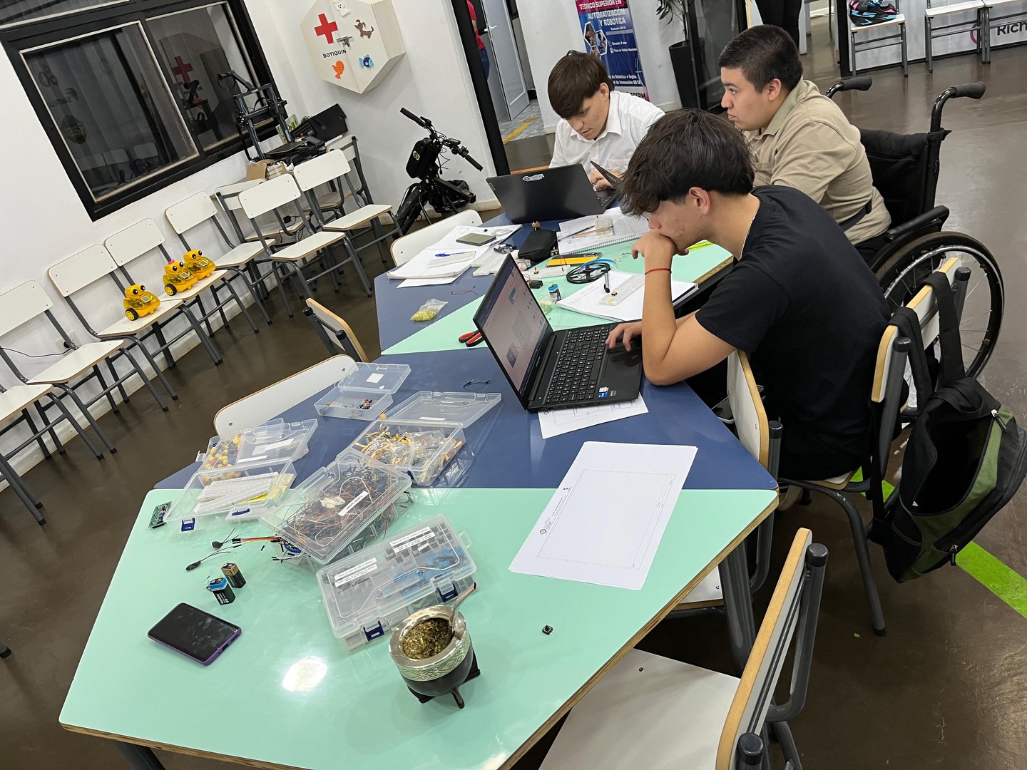 Área desarrollada: Componentes eléctronicos conceptos y su funcionamiento( resistencia, led, pulsadores, placas de pruebas, batería). Esquema eléctrico y su importancia en la electrónica, armado en protoboar usando los componentes explicados en la clase (encender un led usando bateria 9 voltios, pulsador, resistencia y led). Dibujo de esquema en hoja técnica. Conclusión, observación, hipótesis.