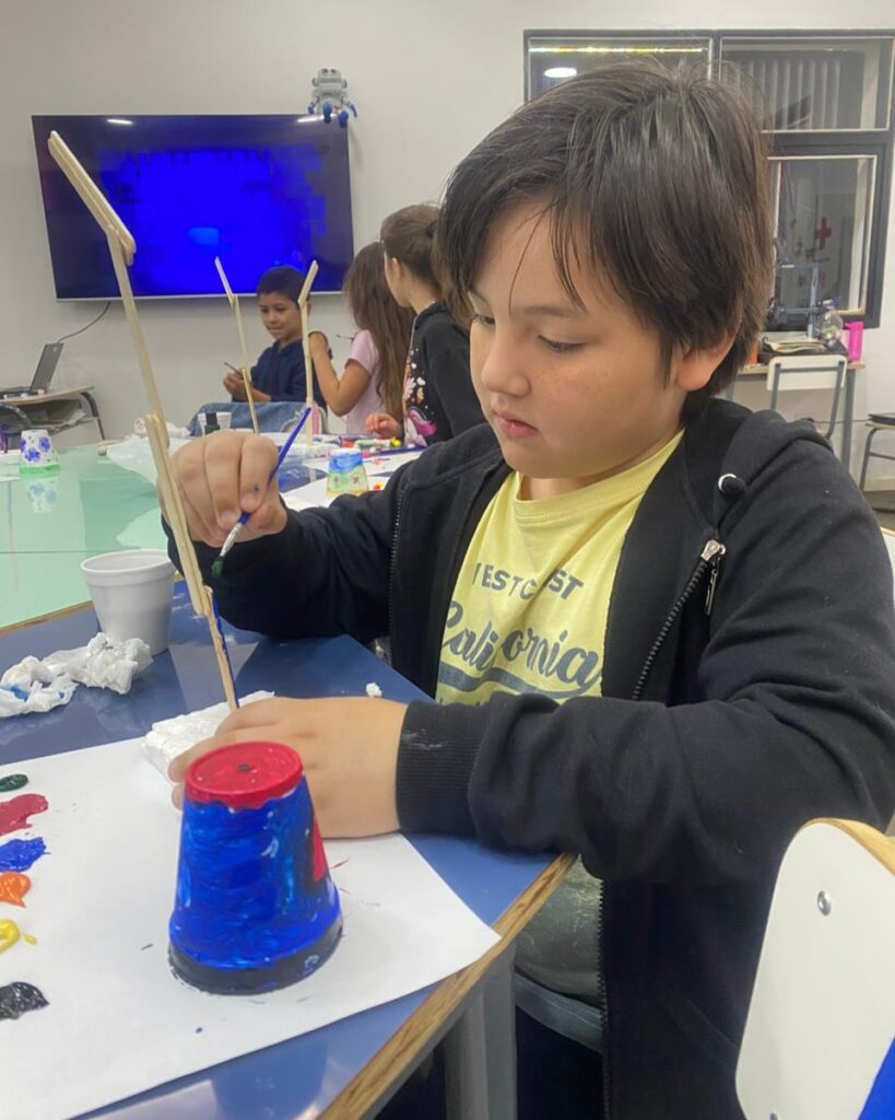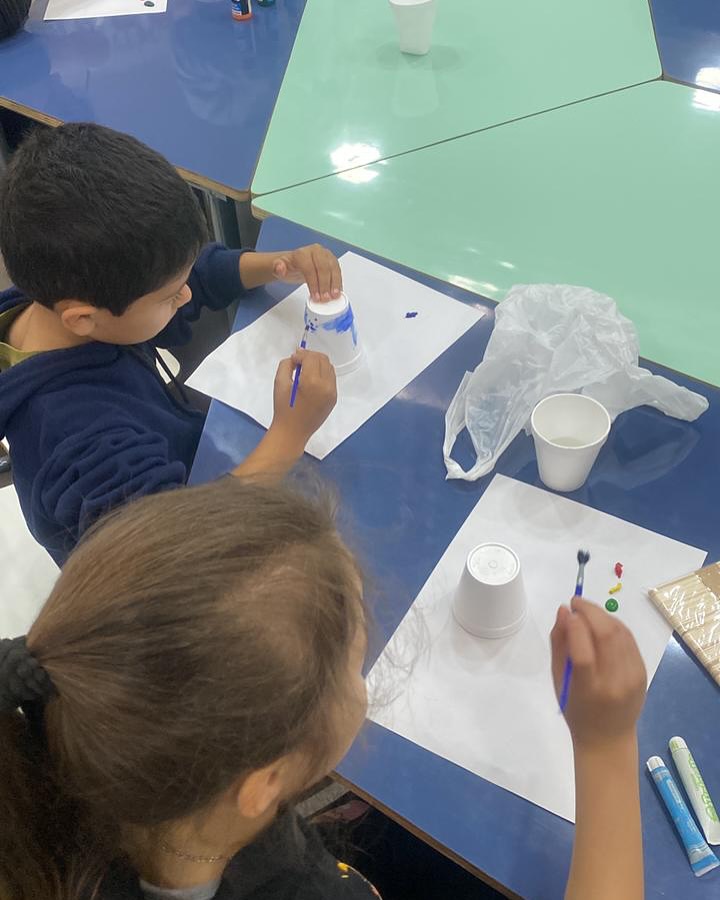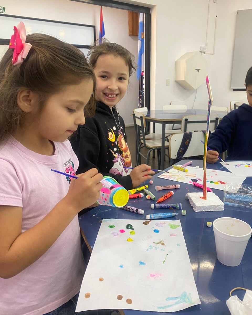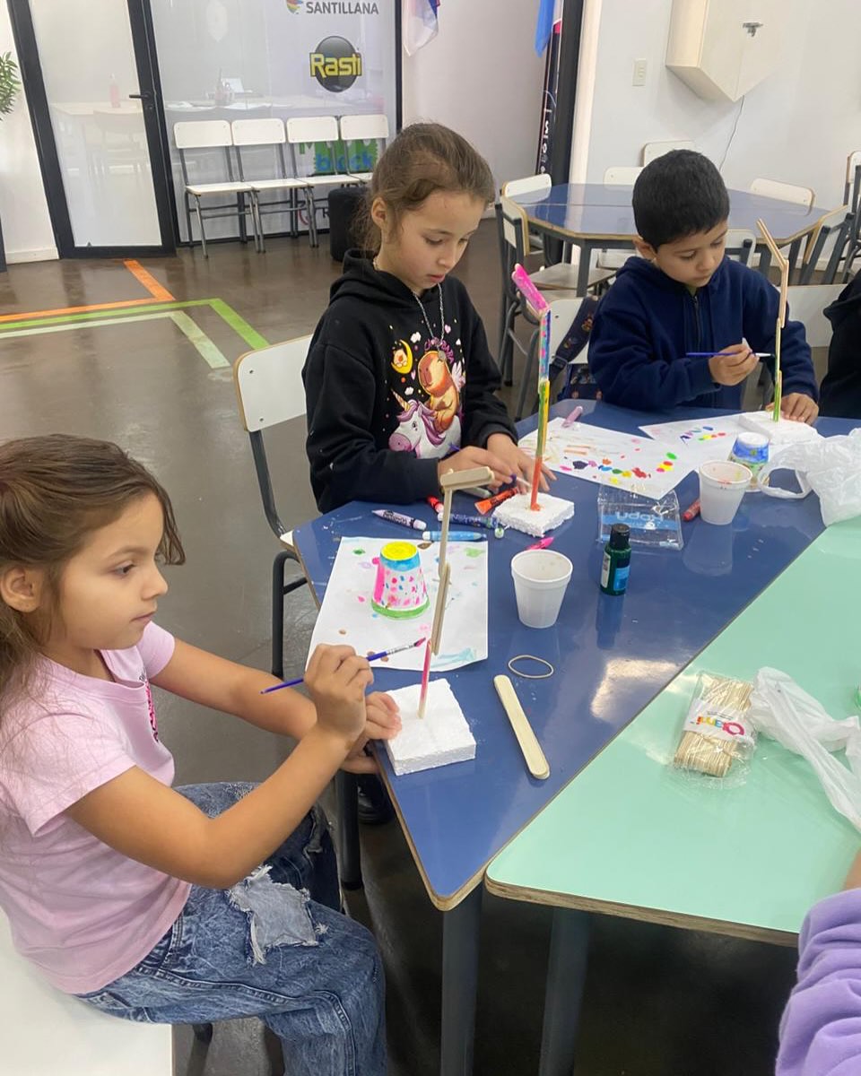 En su anteúltima clase, los alumnos pintaron los palitos que serán el soporte de su lámpara con circuito simple (LED + pila + cables).