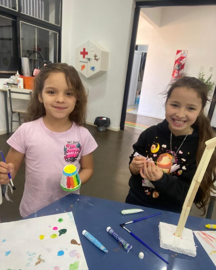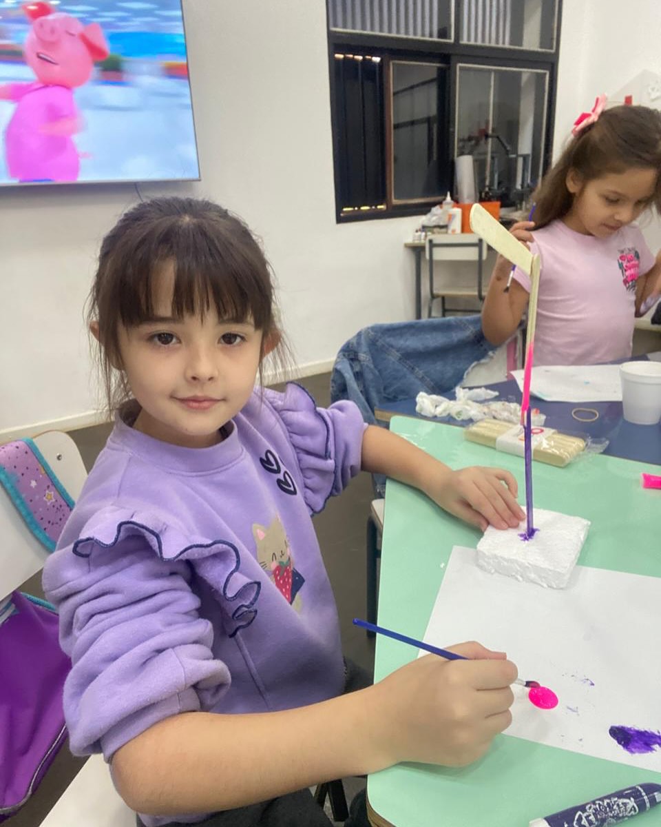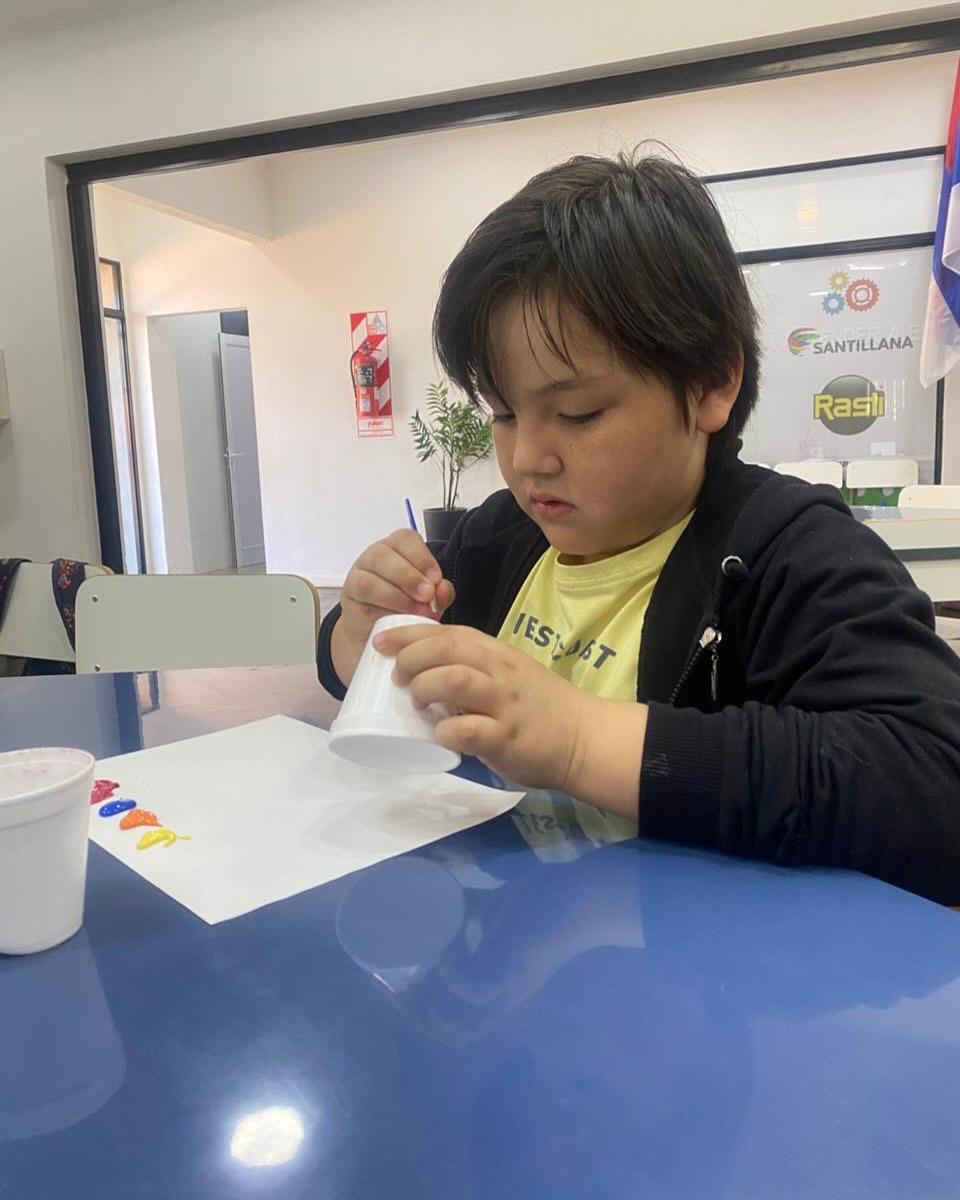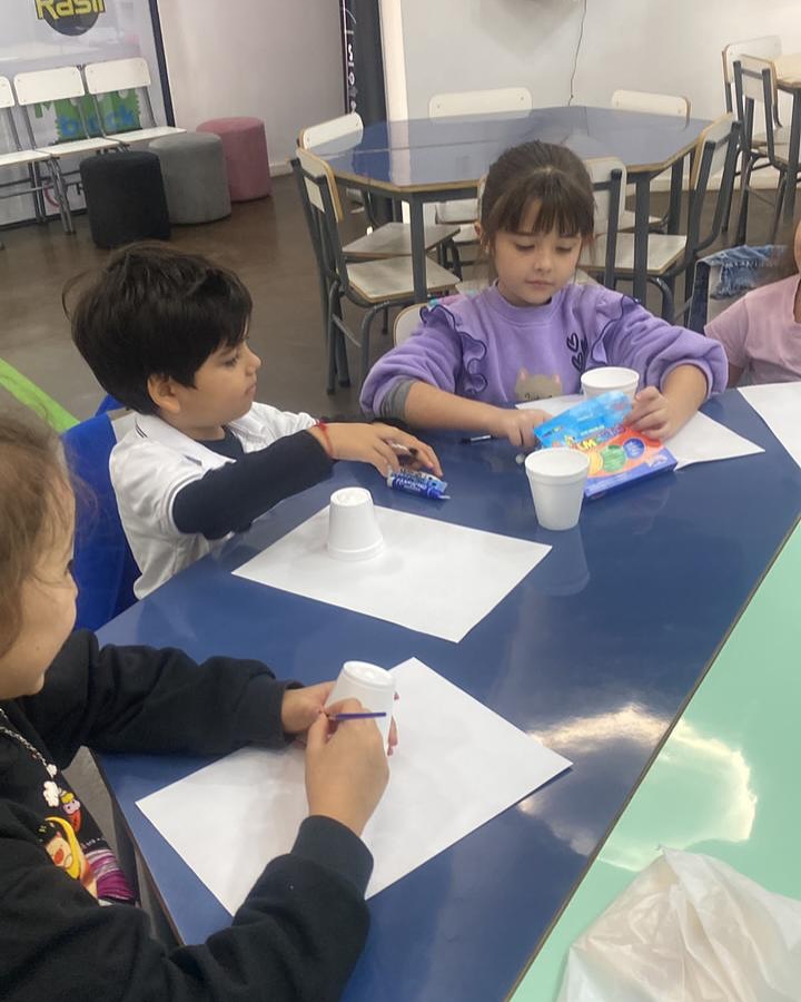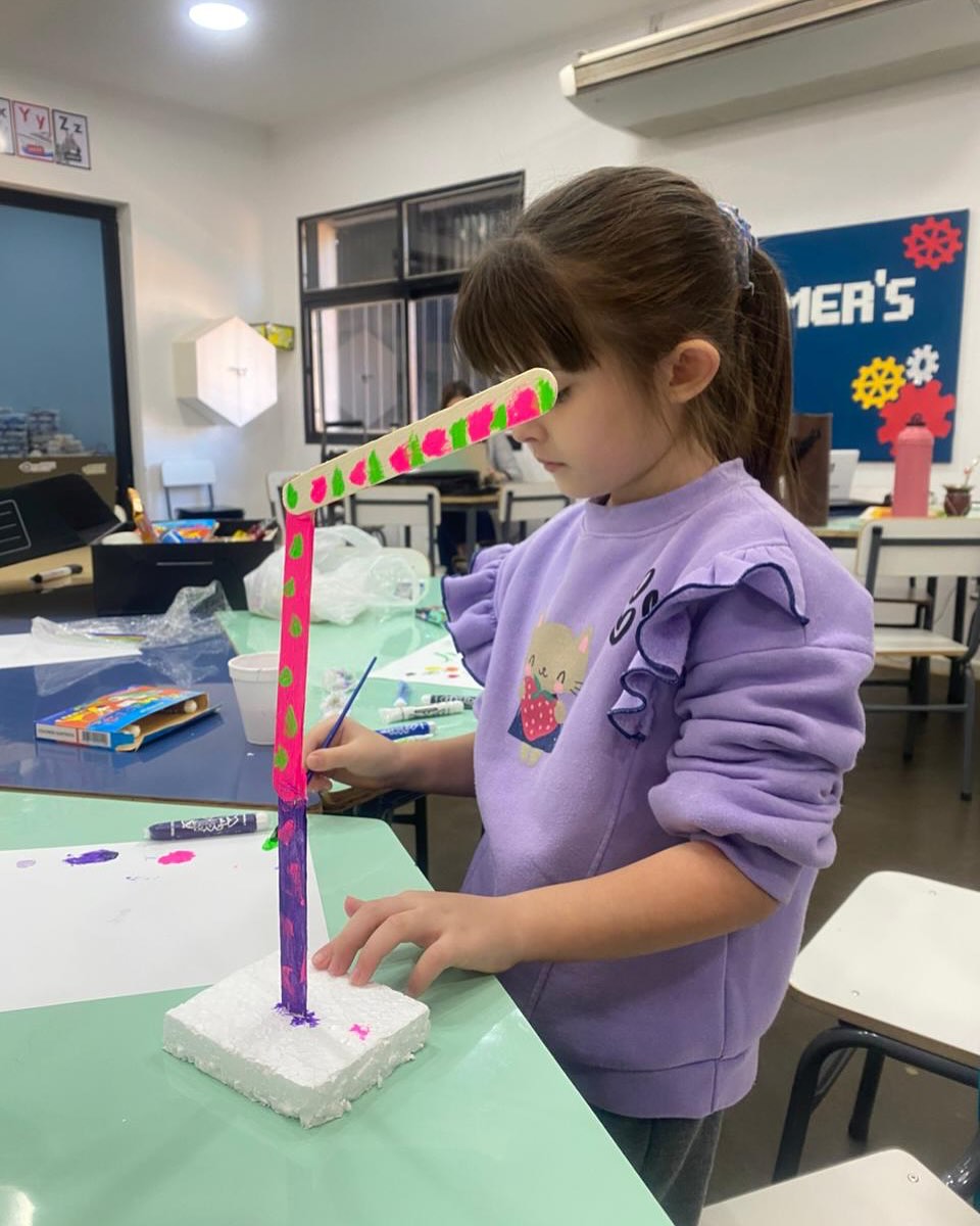 En su anteúltima clase, los alumnos pintaron los palitos que serán el soporte de su lámpara con circuito simple (LED + pila + cables).