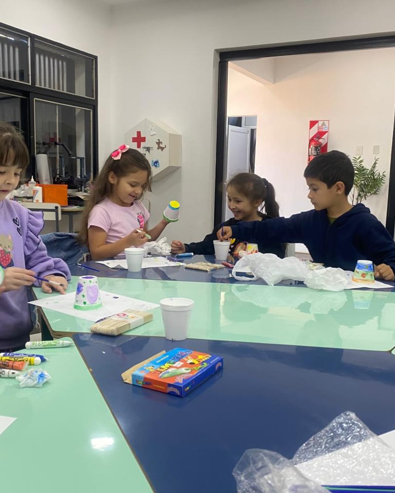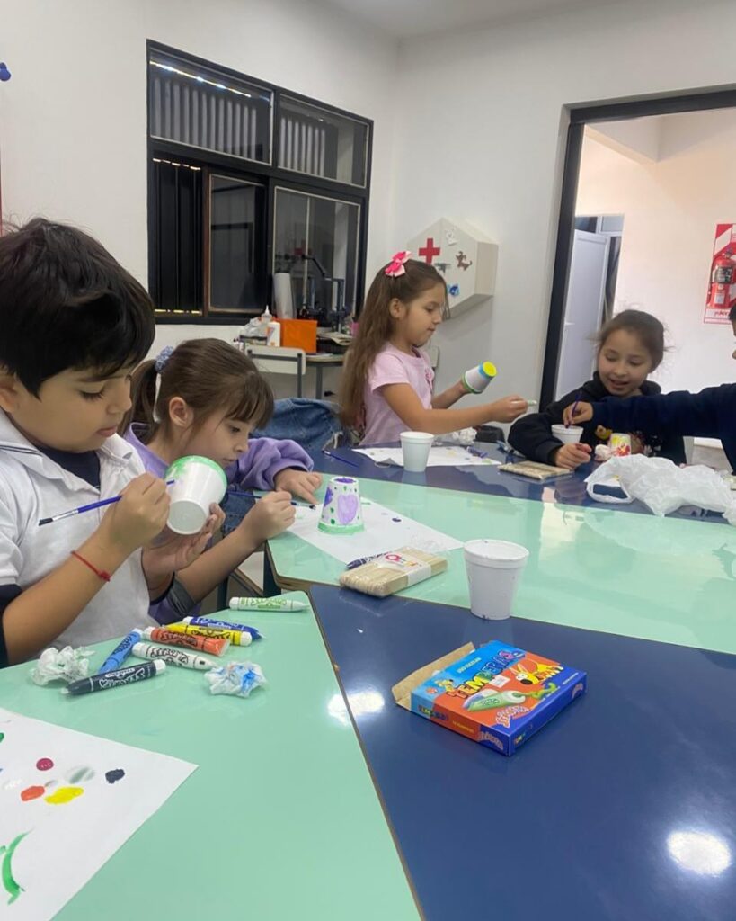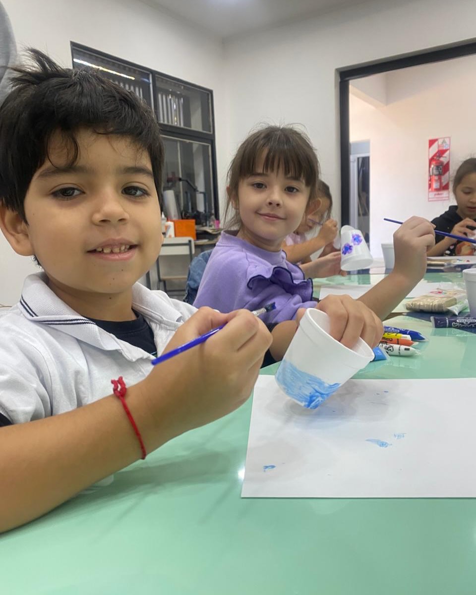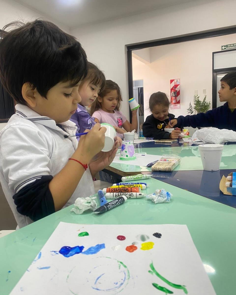 En su anteúltima clase, los alumnos pintaron los palitos que serán el soporte de su lámpara con circuito simple (LED + pila + cables).
