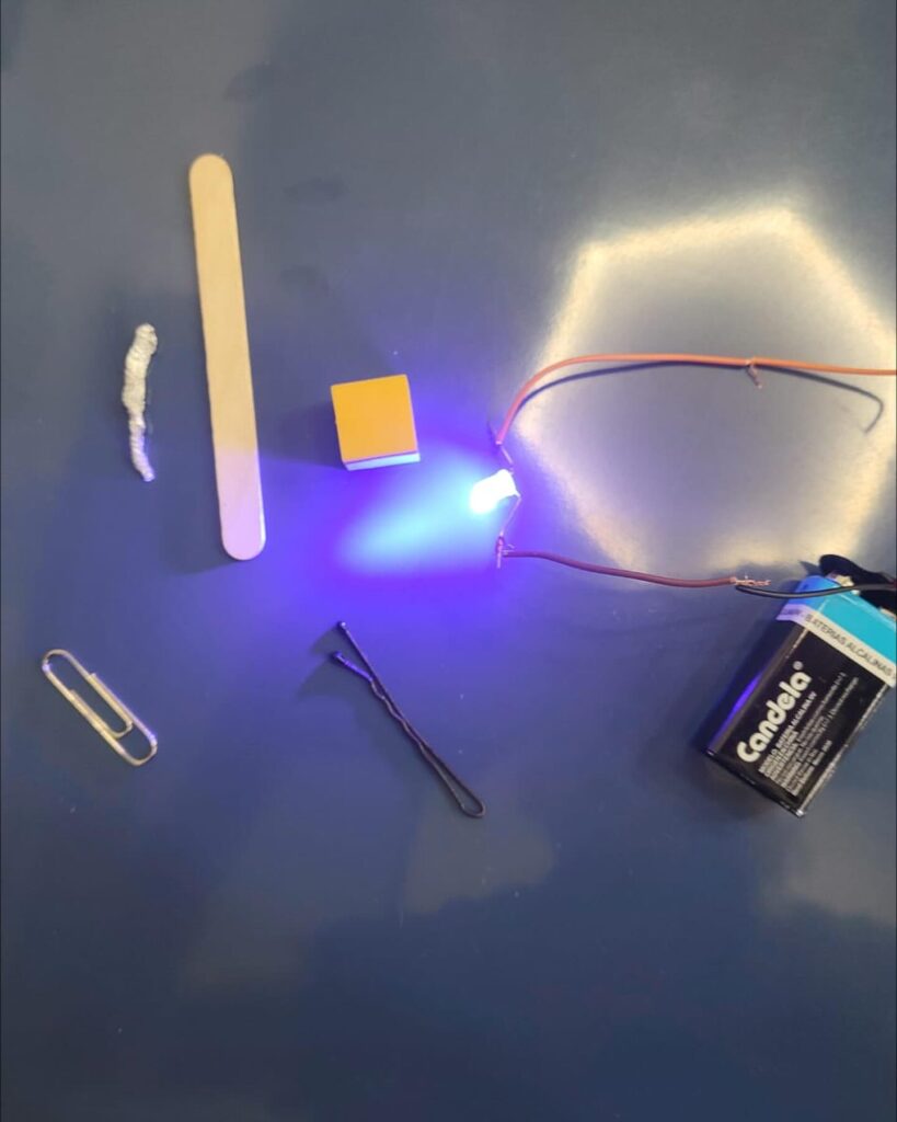 Realizamos un circuito con LED, pila y resistencia, y probamos distintos objetos para descubrir cuáles dejaban pasar la corriente.